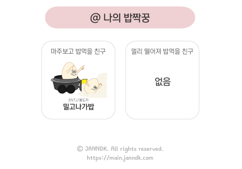 | 밥BTI 🍚 성격 유형별 밥알 캐릭터 둘러보기 (1) | 2023.01.23 |
